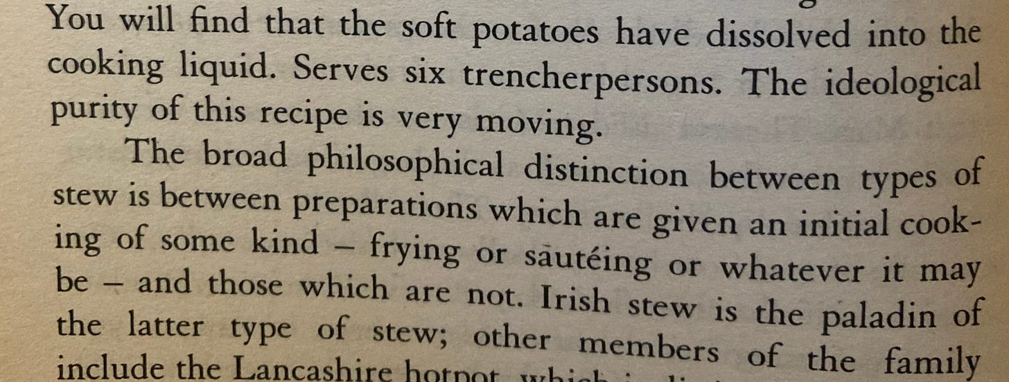 I put together an Irish Stew to a recipe which requires nothing more than layering the various ingredients in a pan and covering them with water and a lid and placing the pan in the oven for three hours with no initial sweating of alliums or searing of meat and although it is not quite ready – two and a half hours into its three hour cook – so may yet be a disappointment but by its smell is not, and I wonder how many of the things we do to food, all that browning and poking and squeezing, are simply to satisfy the chef’s ego, and how much more we might gain sometimes if we just set things in motion and then, like the mystic reaching for God, got ourself out of the way.