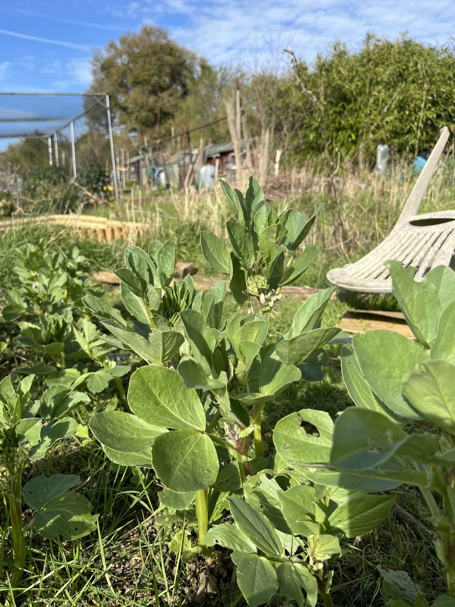 It is sunny, yes, but when the wind blows it is cold, very cold; only yesterday coming back from town I walked into a hailstorm, the picture-frame I was carrying pushing me around like the sails of a windmill. Here the bucket which I had placed over those little stalks of accidentally-forced asparagus has blown off into my next-door neighbour’s plot - I have to retrieve it from among her raised beds, feeling like a trespasser - and one of my chairs has tumbled into the netting protecting my broad beans from rodents. Thankfully nothing is crushed but still I take this as my cue to remove the netting which soon the bean plants will be pushing against, they are long past the stage where a passing mouse might nip straight through their stalk or make off entirely with the seed-bean itself and I do not want to come back in a week and find that the netting was fine enough for aphids to enter but too fine for ladybirds to get in and eat them. The plants are coming into white-and-purple flower and I find myself thinking how good my crop will be, superstitiously forcing the thought from my mind. Other than picking another bagful of nettles there is not much to attend to; there is a big pile of ash on a nearby plot left from a communal weekend session of burning the accumulated prunings of winter, and I scoop some up and sprinkle a little on my compost, a little round the fig tree and around my fruit bushes, and put some in a bottle with some rainwater, for what purpose exactly I’m not sure.