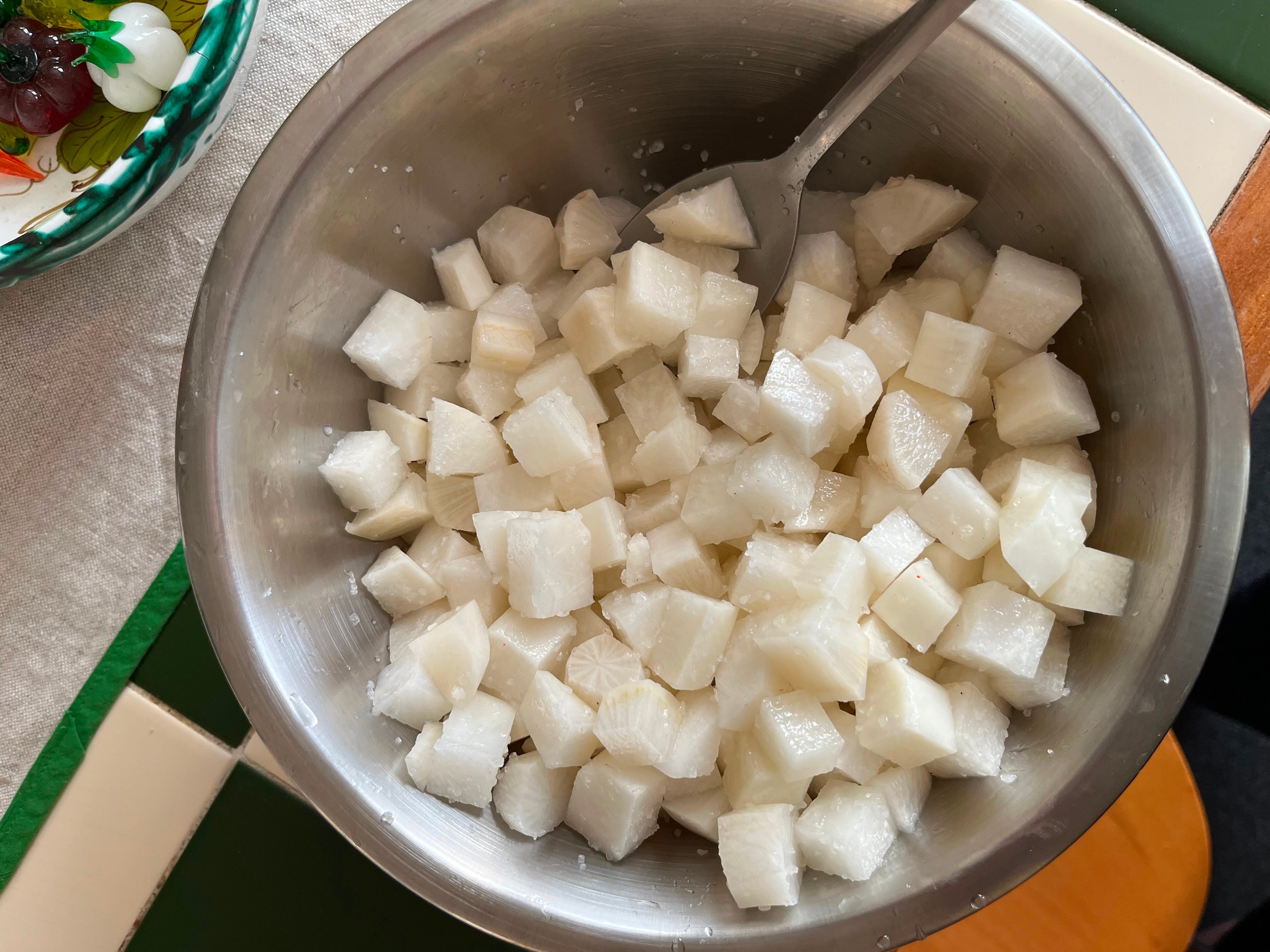 My kimchi recipe is not my kimchi recipe but a reflection of many I have read about or eaten or made before with nothing particularly distinctive about it except the use of cooked rice and pear in the porridge instead of rice flour, which I read about in Songsoo Kim’s writing for Vittles and have used ever since. Feel free to adjust to your own taste and according to what vegetables you have to hand. I used what veg I had from the community gardens; one of the directors of the Margate Crab Museum gave me a bottle of the fish sauce he makes, so I obviously used that too, but I normally just use Squid Brand.